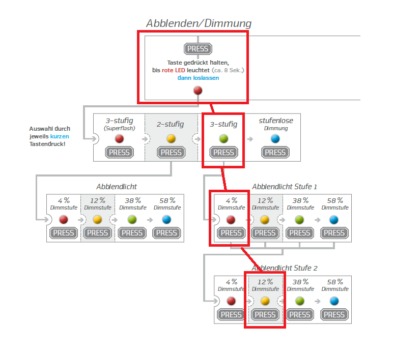 Danke undTrust me: ich kenne die Anleitung und wechsle auch die Einstellungen regelmäßig. Ich fahre normal 3-15-26, manchmal aber auch 1-10-26. Irgendwie wollte ich dann 1-3-26 programmieren und obwohl ich es mehrfach wie in der Anleitung beschrieben gemacht habe, war das Ergebnis immer ein 3-3-26 (erste und zweite Stufe identisch auf 12% = 3W).