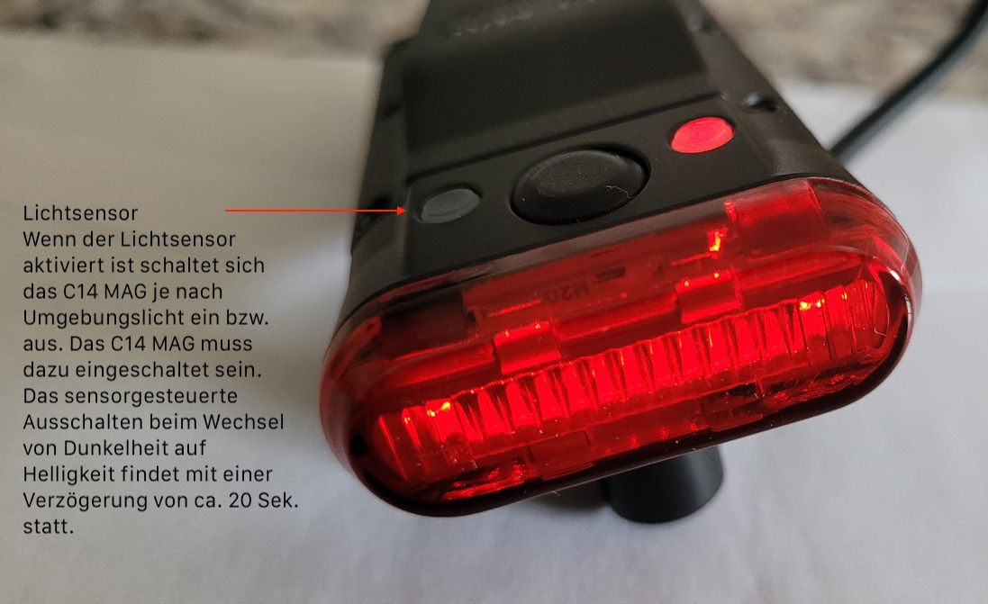 Heute habe Ich das C14 Mag wieder geladen und dabei festgestellt, das sowohl die LED für die Ladeanzeige leuchtet, als auch die Haupt-LEDs vom Rücklicht selbst schwach dabei leuchteten.