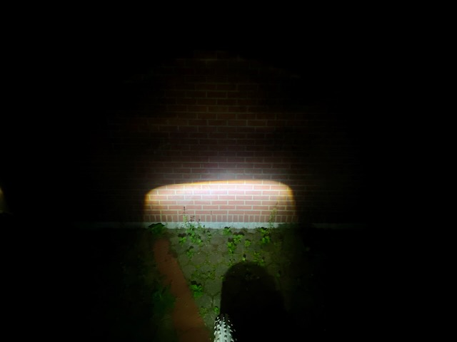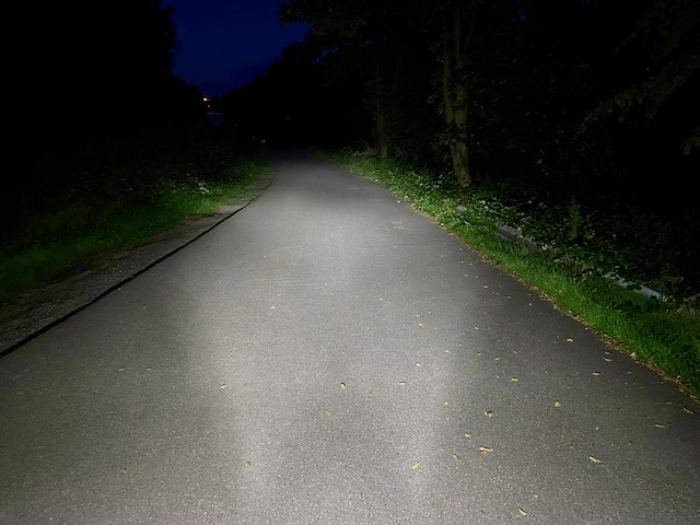 Es gibt diese, nach Vorne hin, hintereinander folgenden deutlichen Dreiecke, sie ergeben irgendwie zusammen den Umriss eines Teufel- oder Wolfskopf mit Ohren (in meiner Fantasie), und reichen mit viel Power sehr weit. Eingefasst werden sie vom restlichen „Streulicht“. Natürlich bei Weitem nicht so ruhig wie das der SL AF, aber erkennbar viel mehr Druck, bessere Sicht, auch näher um das Bike herum, Wegesrand.