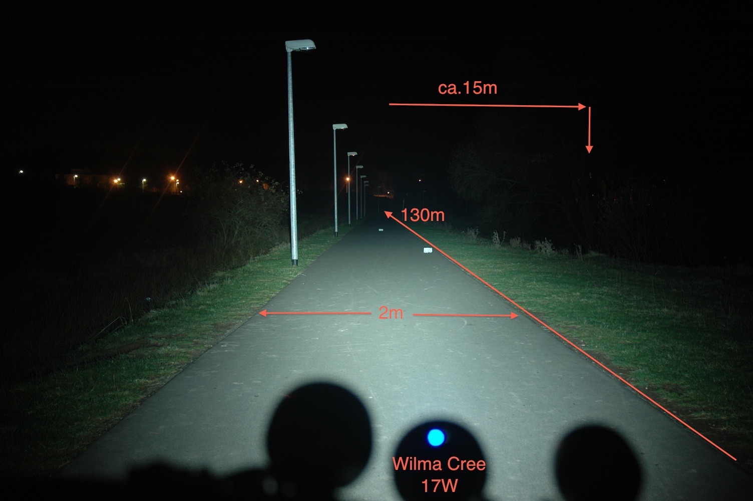 anbei noch Bilder für den Spotvergleich. Allerdings sieht es wenn man auf dem Fahrrad sitzt wie oben aus. Es soll nur den Spot demonstrieren. Die Spottigkeit kommt auf alle Fälle der helligkeit auf dem Weg zugute.