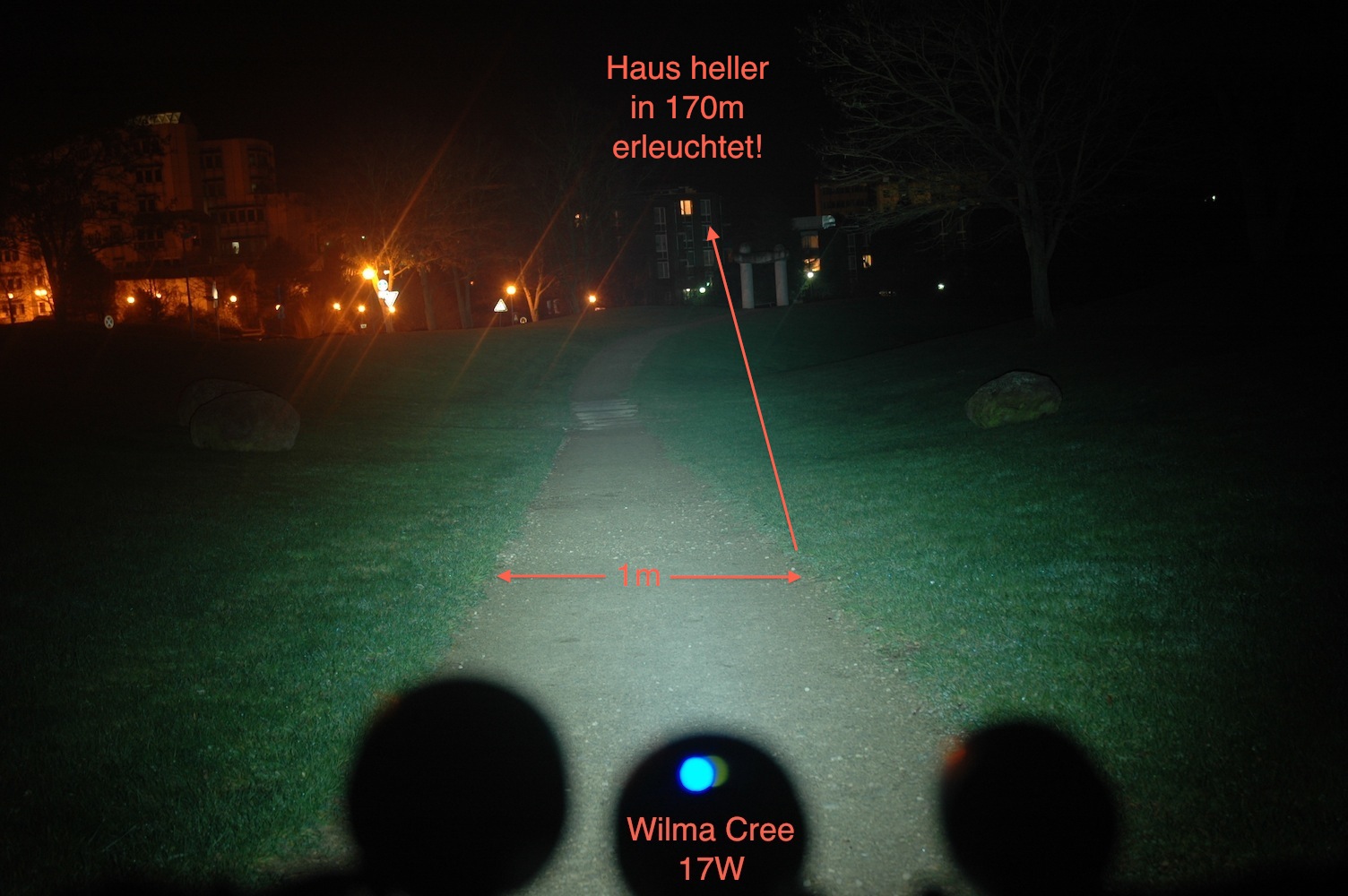 Im Vergleich dazu schafft die Betty die ca. 15m Ausleuchtung auch geschätzt. Das ganze in ca. 90-100m Entfernung. Ich hoffe ich vertue mich da nicht. In der Allee konnte ich einen Weg nachmessen und bei der Betty waren es da 15m zu einer Seite. Hier scheint die Wilma etwa nur halb so weit nach rechts in der Breite zu strahlen.