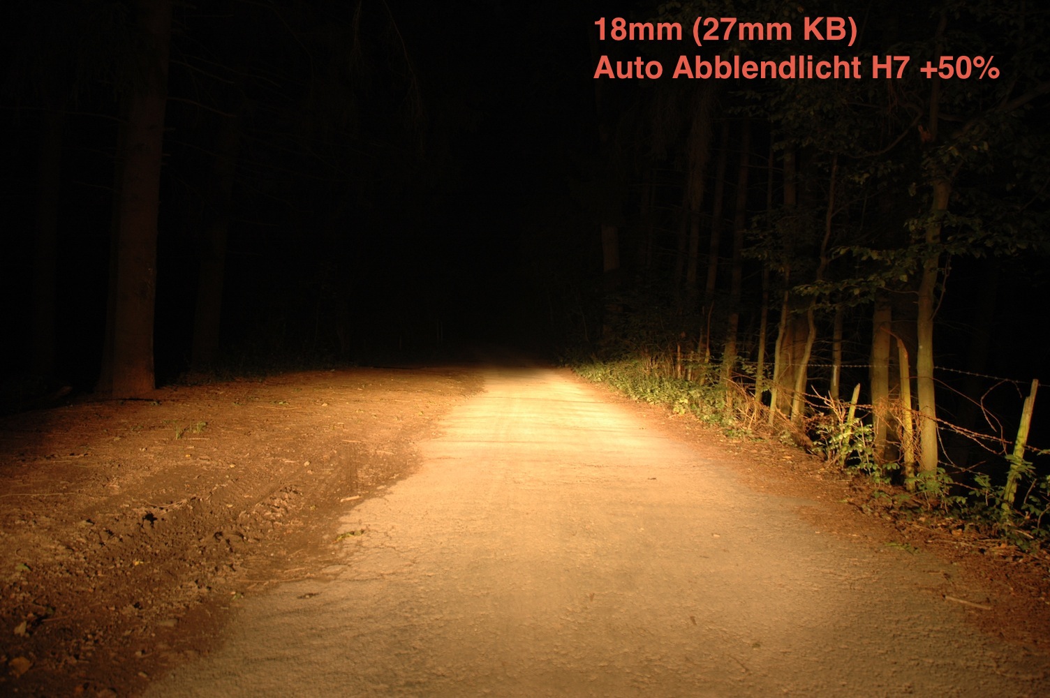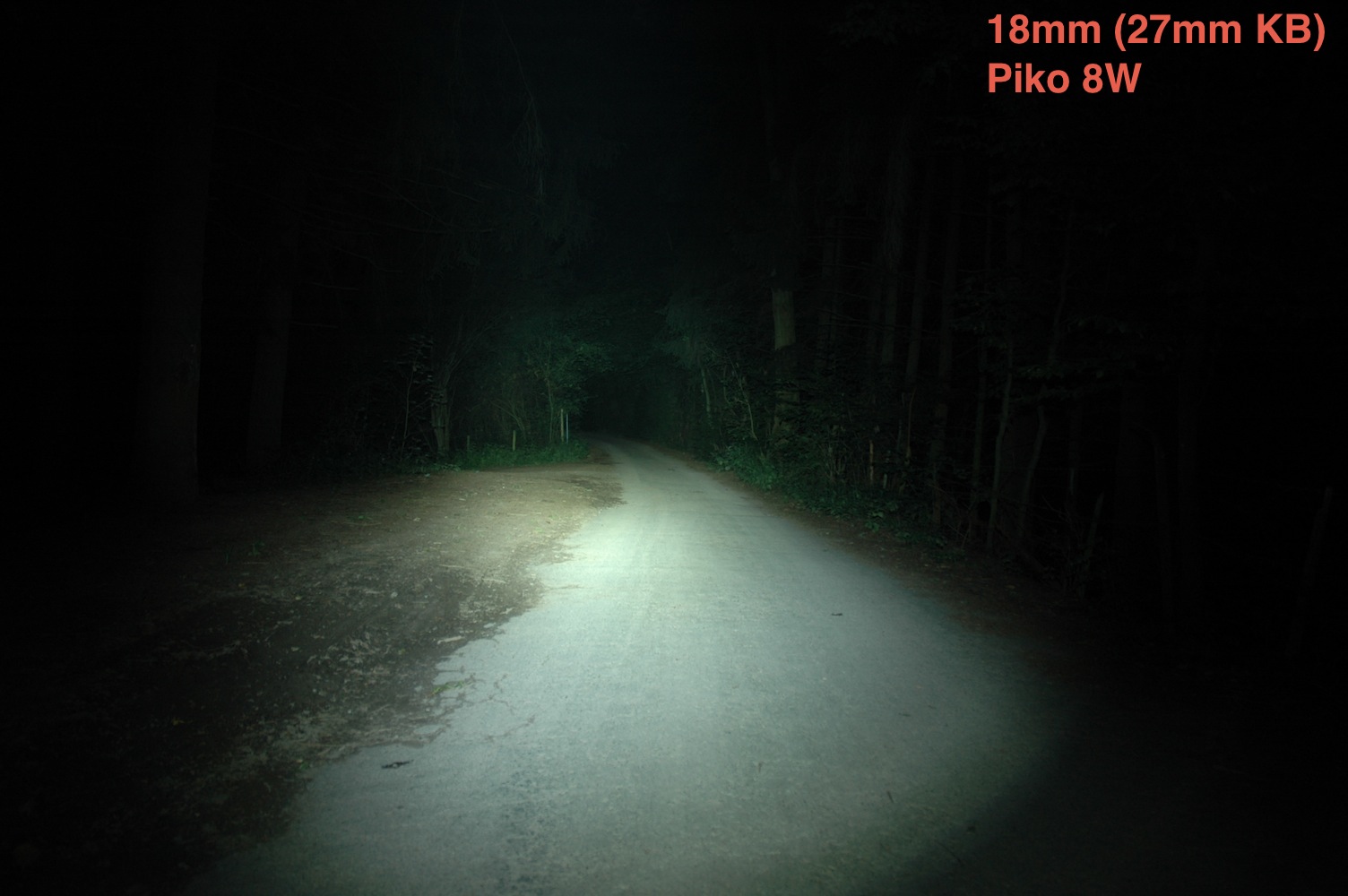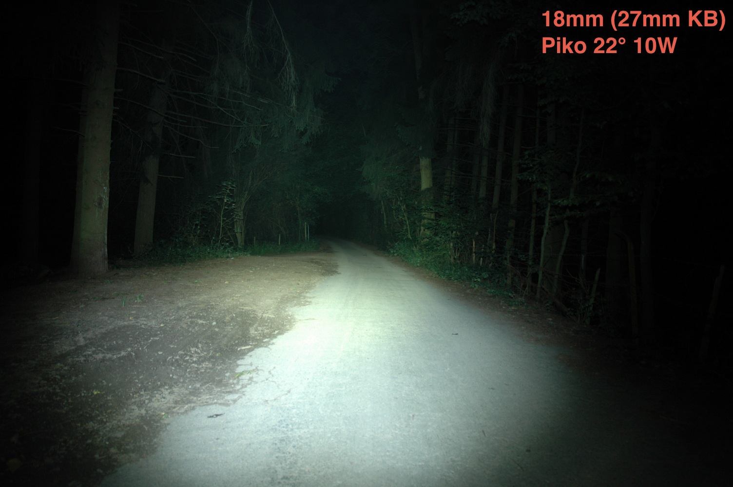 Das Problem mit den Fotos ist das sie nicht immer das gesamte Licht auffangen, insbesondere das schwächere Licht was mit dem Auge durchaus wahr zu nehmen ist. Ich versuche den Unterschied besser zu beschreiben. Die Piko 22° und die Tesla haben eigentlich die gleiche Breite in der Ausleuchtung auch wenn das nicht so ganz rüber kommt auf den Fotos. Die Piko verteilt das Licht aber viel besser und für das Auge angenehmer als die Tesla. Dadurch das unser Auge adaptieren kann sieht man bei der Piko nur sehr weiche Übergänge und die gesamte Szenerie erscheint im gesamten gleichmäßig heller. Auf den Fotos ist der gesamte Randbereich leider nur schwarz. Das Auge kann dort aber noch ein schwaches Restlicht wahrnehmen so das man einen gesamten Überblick hat.