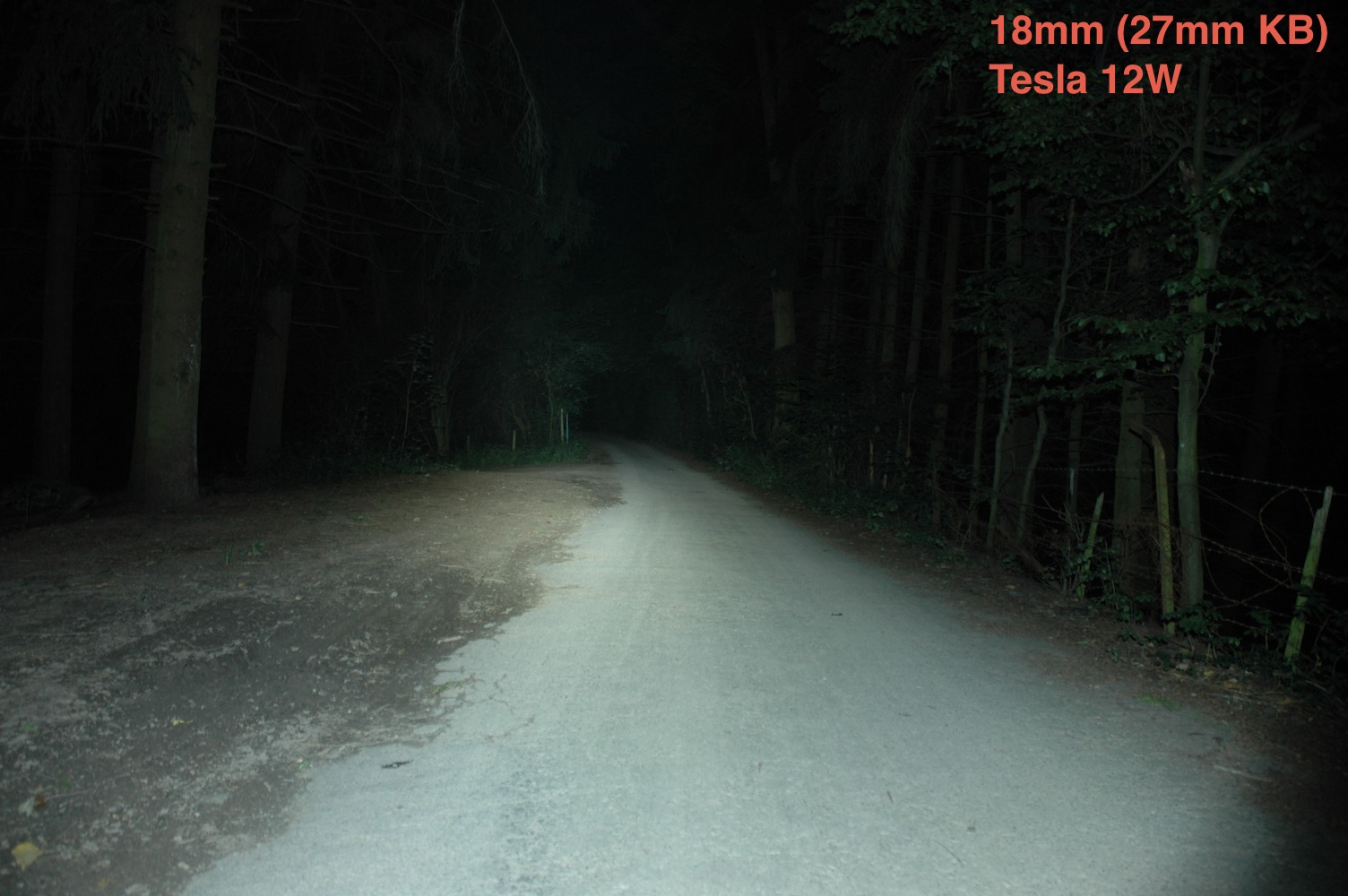 Der Spot ist genauso groß wie der Spot einer Betty 16°, allerdings natürlich etwas schwächer. Insgesamt fehlt der Piko an der großen Reichweite wie bei den Bettys mit 22° und 16° Linse. Aber sie spielt mit ihrer neuen und helleren Ausleuchtung jetzt ganz klar auf Betty niveau obwohl (gerade weil!) sie so klein ist. Wer den helleren Spot liebt (wie schon mit der 16° Betty) sollte das mit dem Umstieg nochmals überdenken und nicht umsteigen. Für die Tesla spricht meiner Meinung nach eigentlich nichts mehr.... Der sehr große und breite Spot mit weichen Übergängen zu den Rändern ist im Vergleich eine deutliche Verbesserung. Auf den Fotos sieht man diesen Effekt auch. Während die Tesla in der Ferne kaum vom weiteren Verlauf des Weges zeigt sieht man mit der neuen Piko den gesamten Baum in der Ferne und den weiteren Verlauf der Straße.