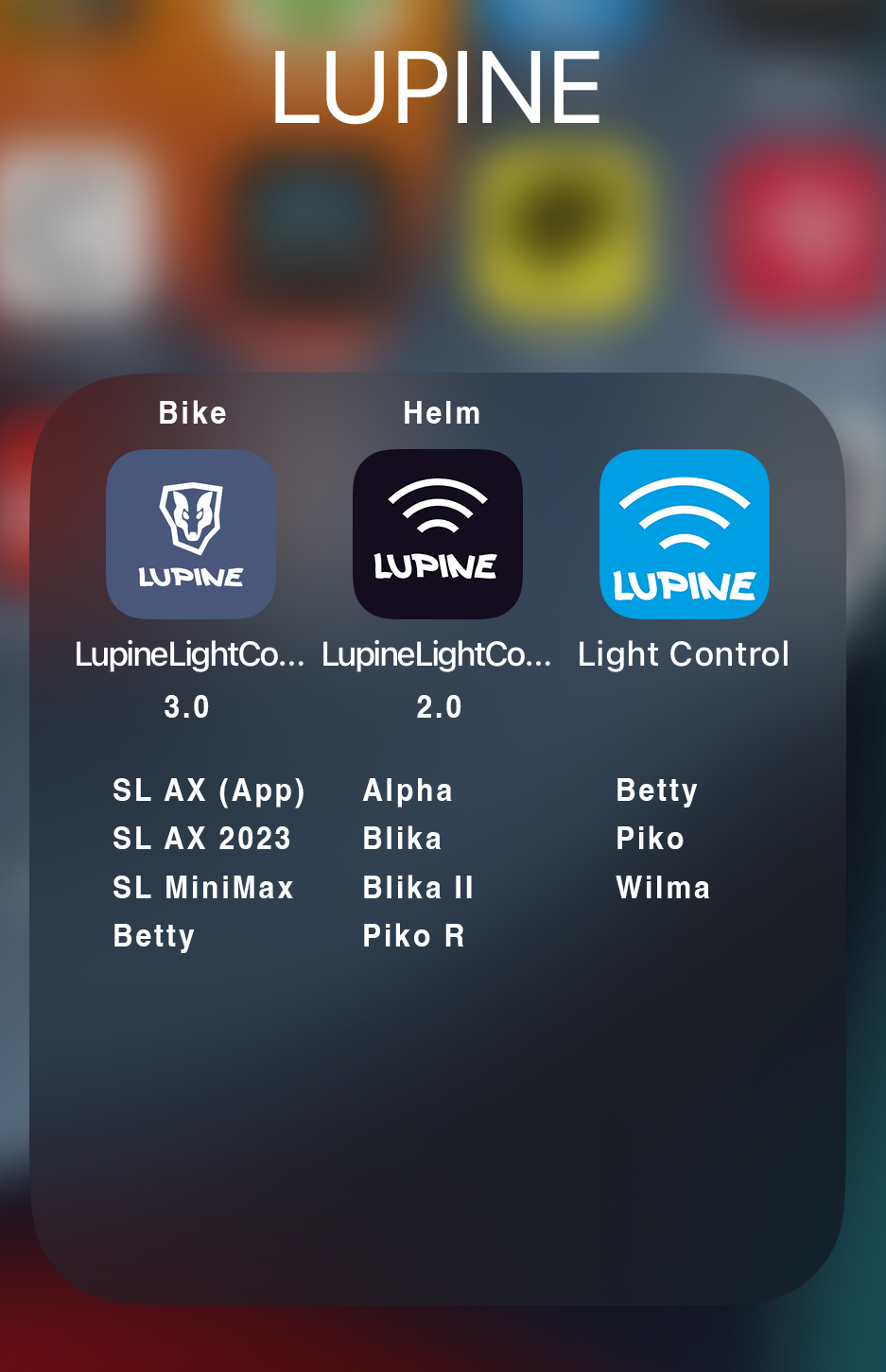 Bei mir: Ordner für Lupine, blaue App fürs Bike, schwarze App für Helm. (Die hellblaue App könnte ich wohl löschen.)