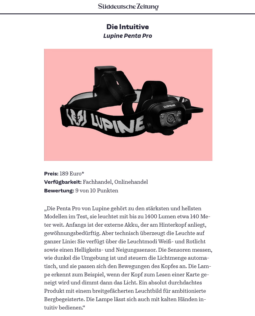 Die Süddeutsche hat diverse Stirnlampen getestet und war von der Penta Pro sehr angetan. Das freut uns natürlich und gibt uns das gute Gefühl , das wir wohl schon wissen was wir machen :)