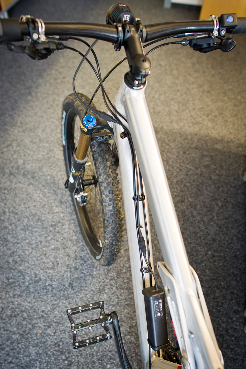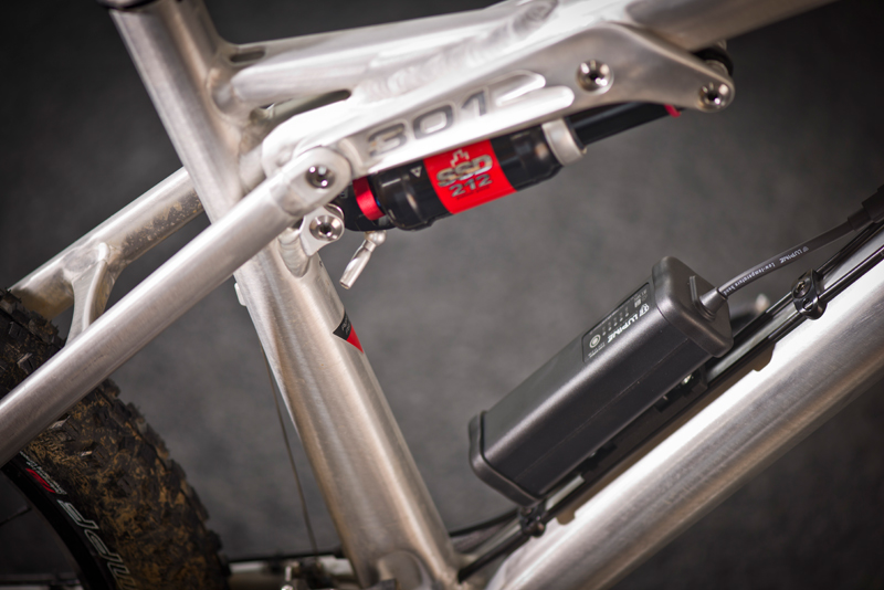 Der Dämpfer sitzt zentral im Rahmen, so dass kaum der 11,2 Ah Akku platz findet. Die Flaschenhalter Muffen sind nicht vorhanden oder so platziert,